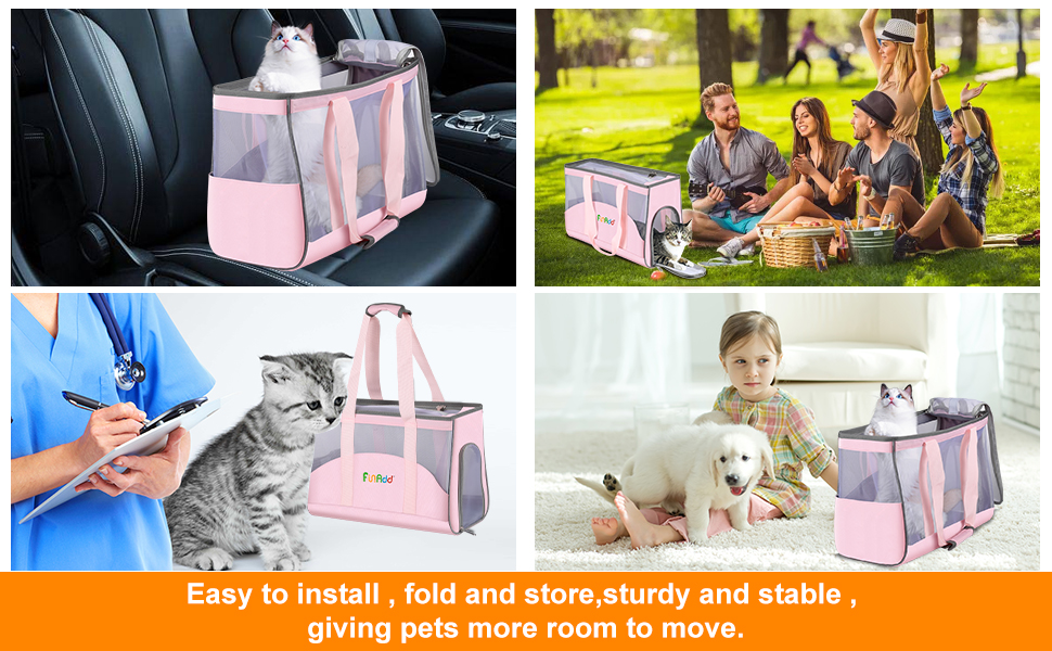 - Suitable For Travel : This collapsible cat carrier has a padded handle and can be carried by hand or over one shoulder. This pet carrier is easy to carry and store. Provide more outdoor activities, such as traveling, biking, walking, camping, hiking and so on.